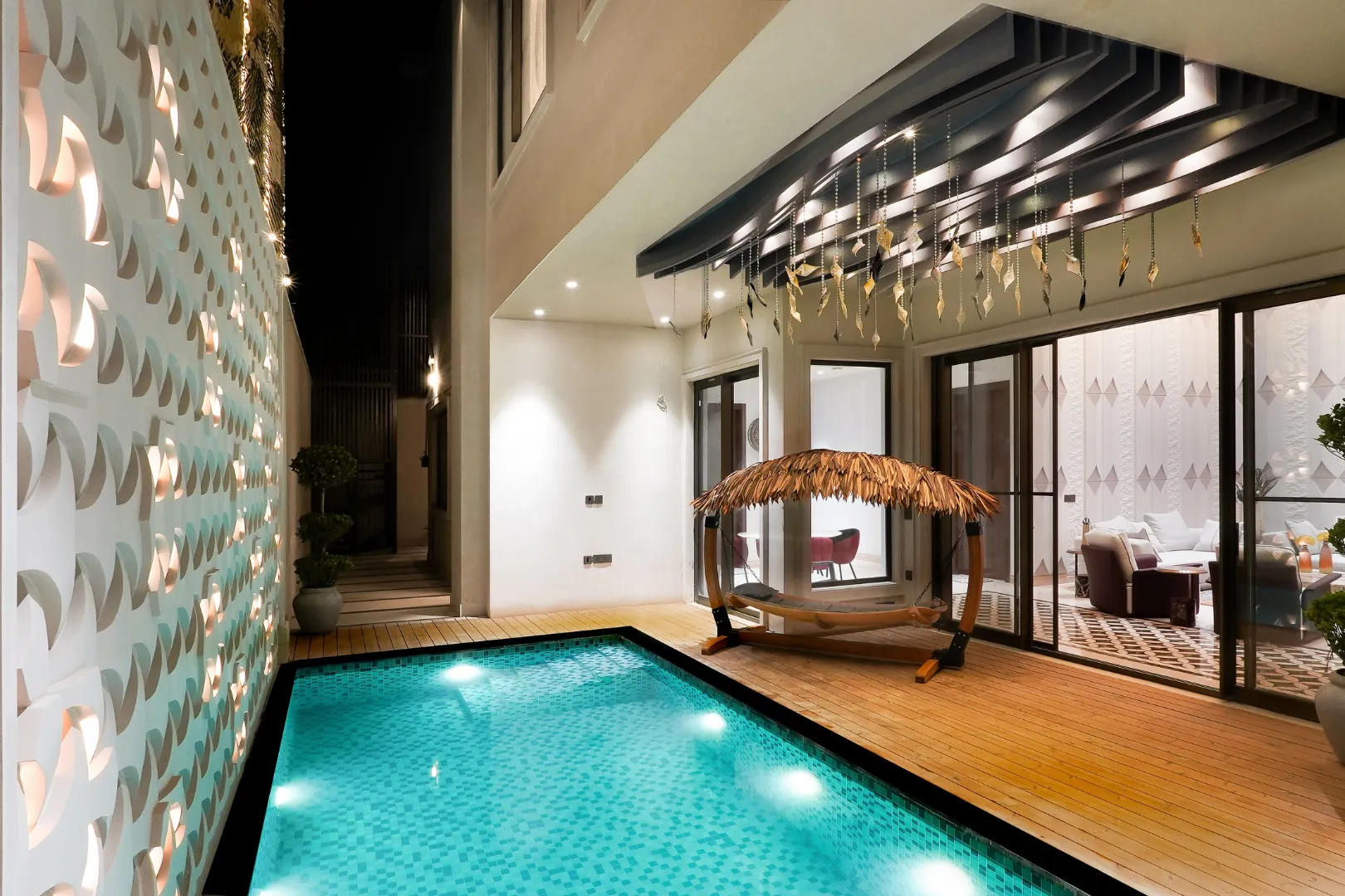 A double-height living area anchors the home, opening visually to an indoor pool courtyard that introduces a quiet, resort-like pause. Natural materials and a muted palette lend understated elegance, while thoughtfully designed circulation areas blur the line between movement and living, ensuring the house feels cohesive, calm, and effortlessly functional throughout.