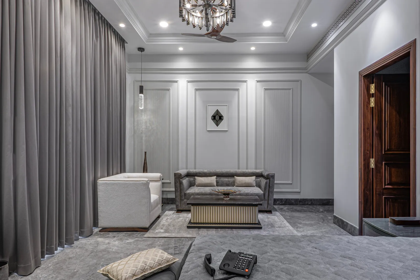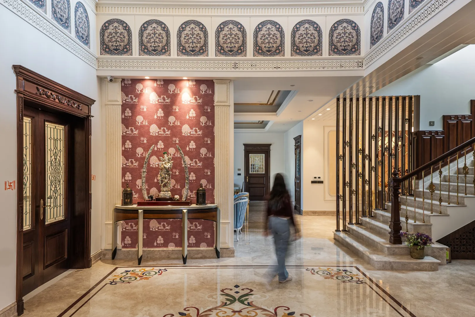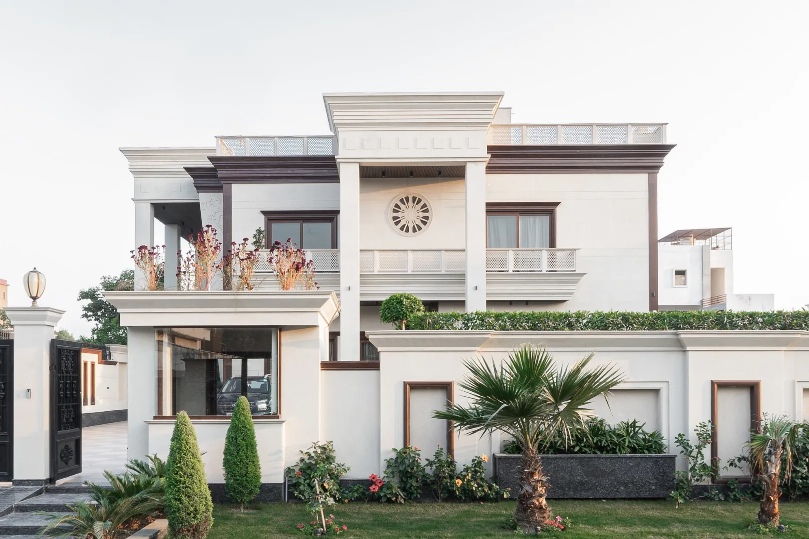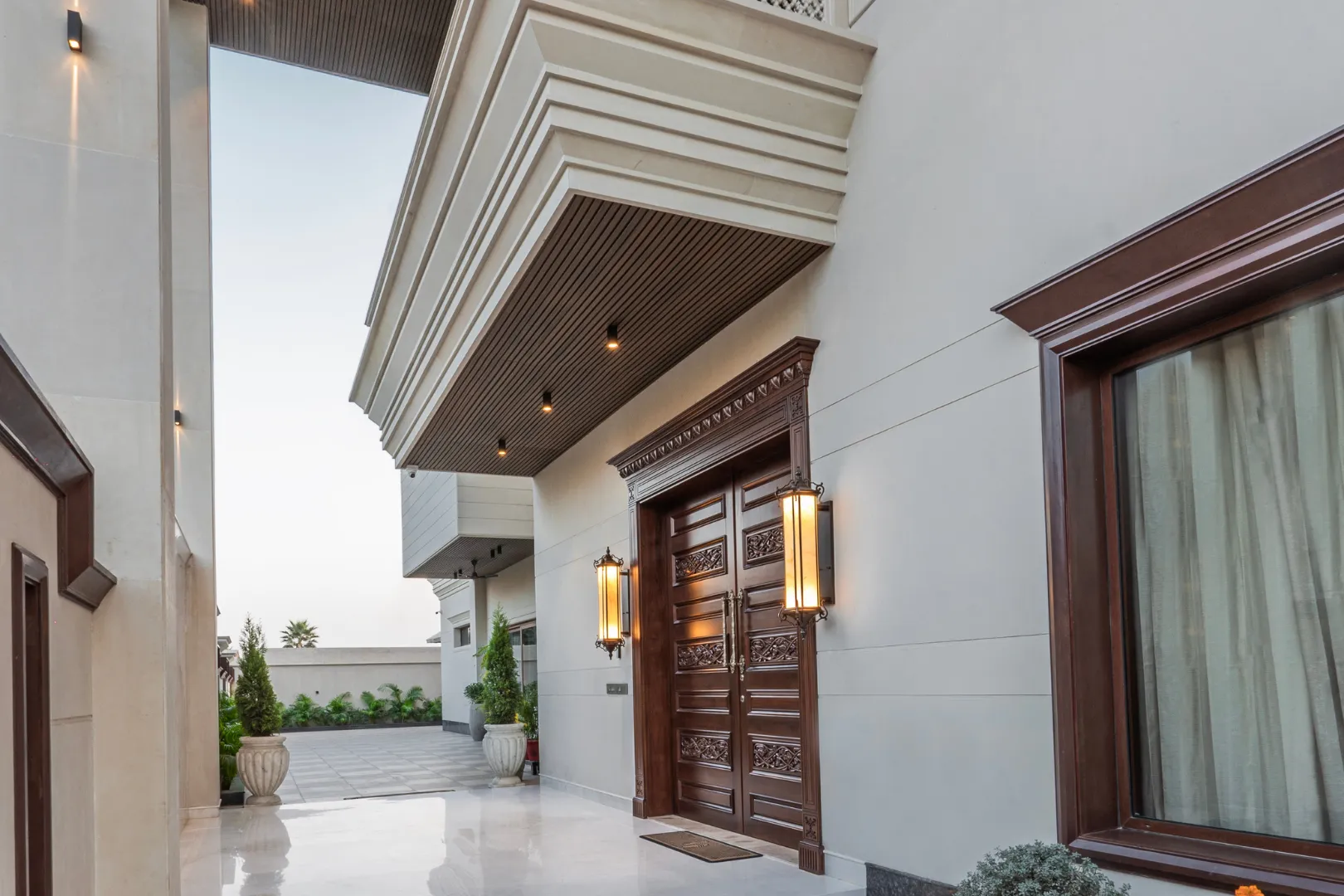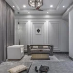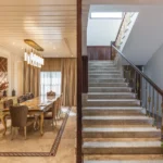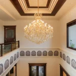 A double-height living area, adorned with ornate mouldings and Italian flooring, creates a luxurious atmosphere. The design prioritizes sustainability through the use of local materials and energy-efficient fixtures, perfectly capturing the client’s vision of “Modern Elegance with Classical Refinement”