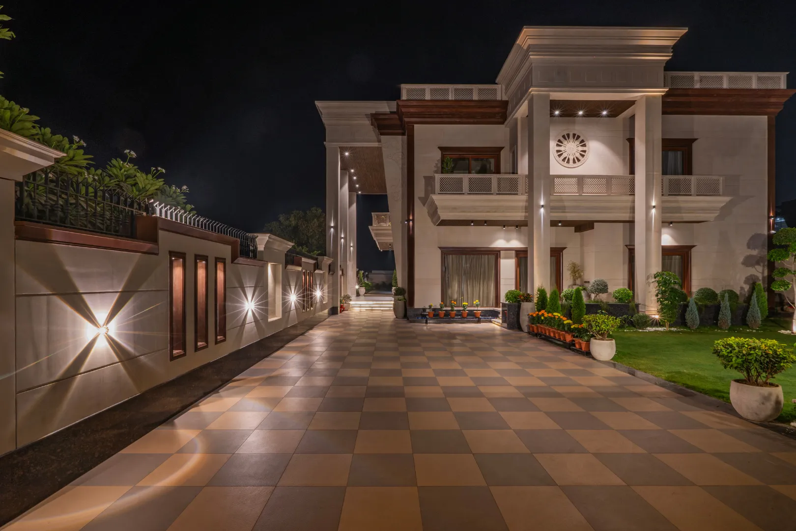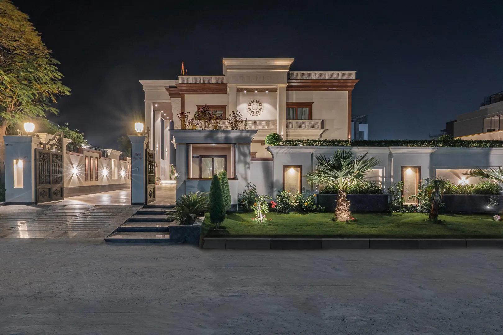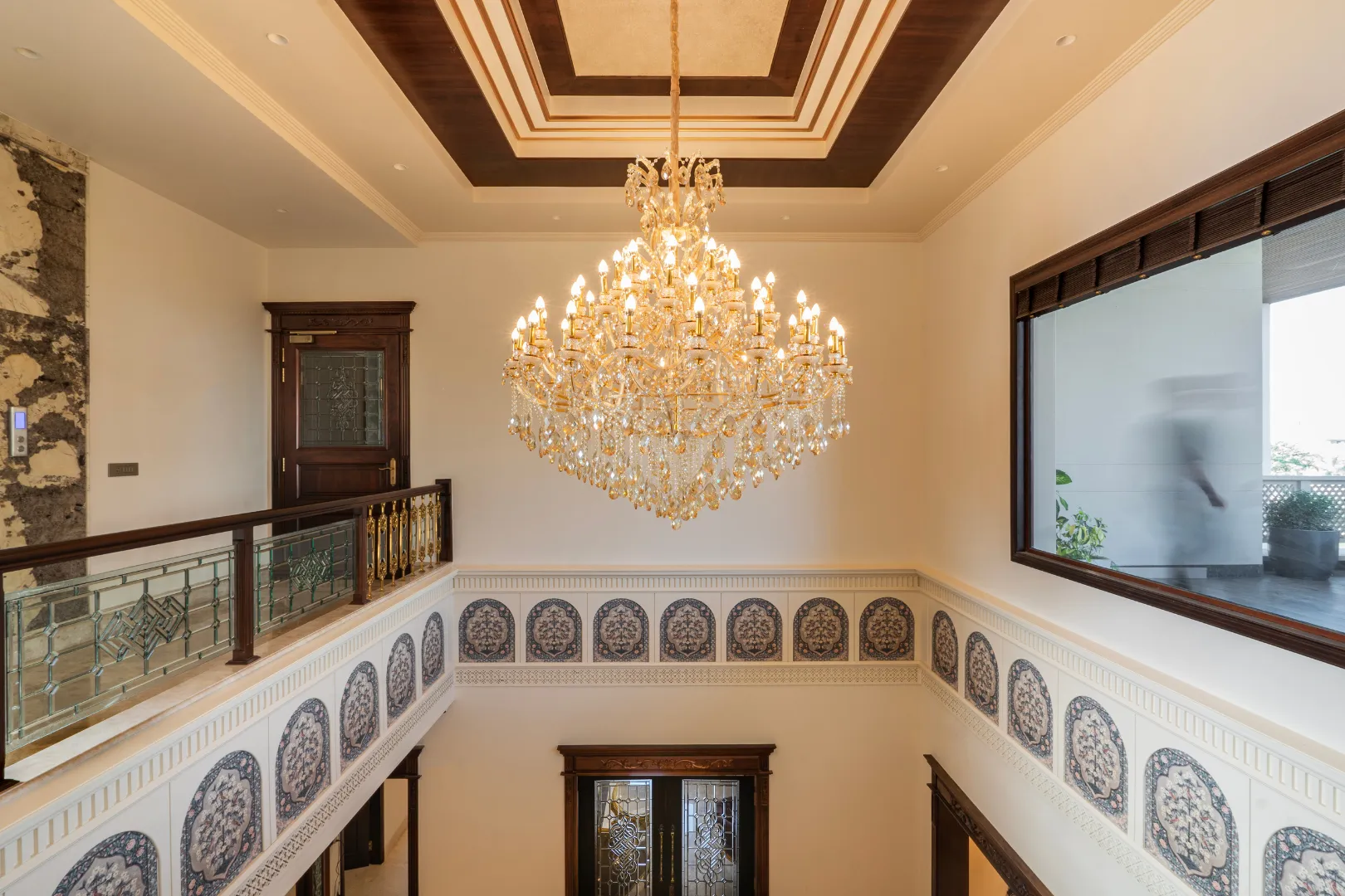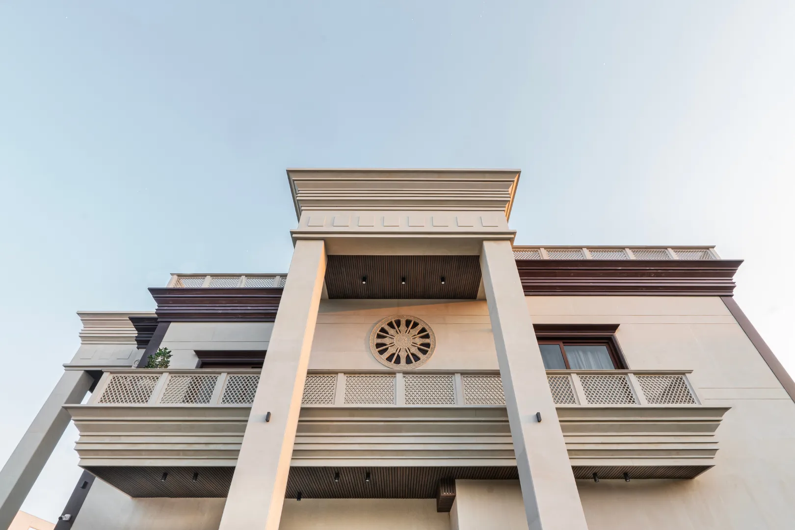 A double-height living area, adorned with ornate mouldings and Italian flooring, creates a luxurious atmosphere. The design prioritizes sustainability through the use of local materials and energy-efficient fixtures, perfectly capturing the client’s vision of “Modern Elegance with Classical Refinement”