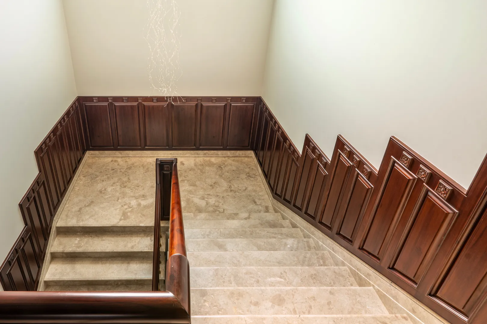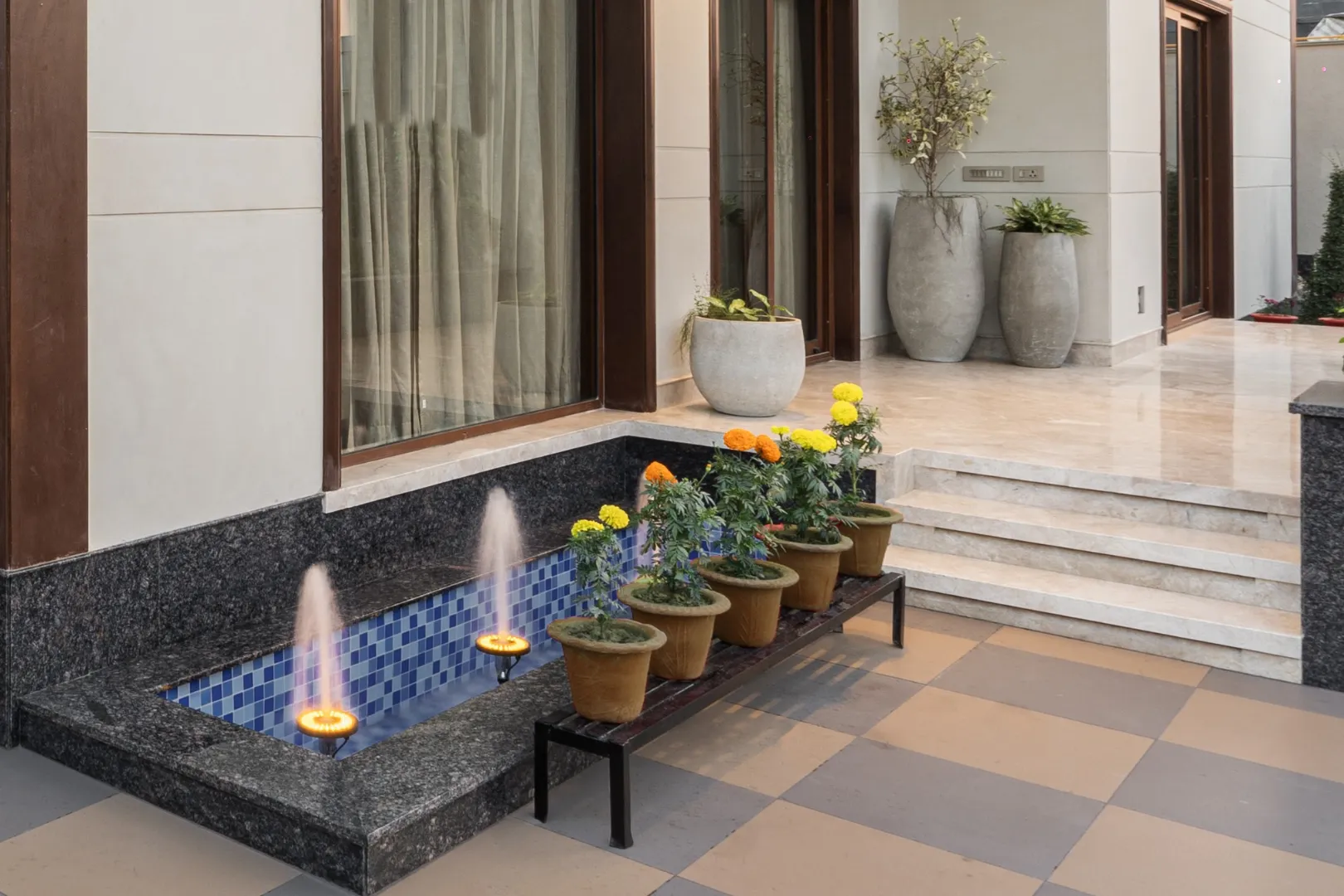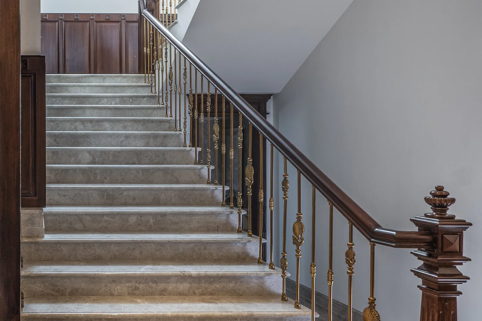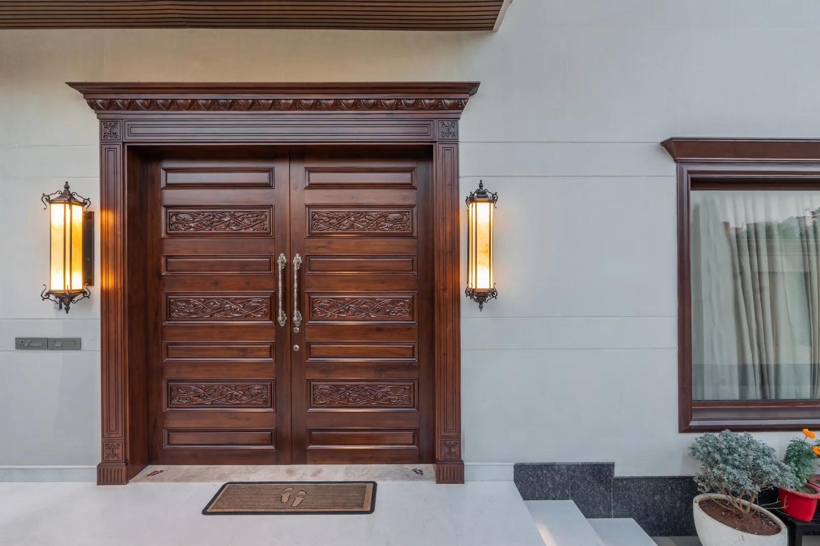A double-height living area, adorned with ornate mouldings and Italian flooring, creates a luxurious atmosphere. The design prioritizes sustainability through the use of local materials and energy-efficient fixtures, perfectly capturing the client’s vision of “Modern Elegance with Classical Refinement”